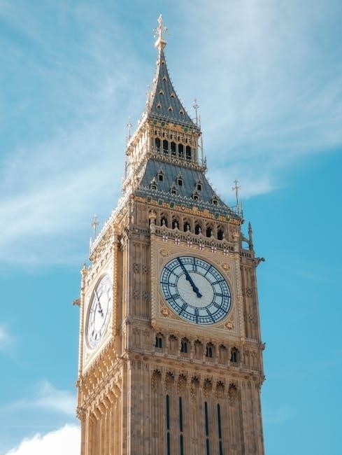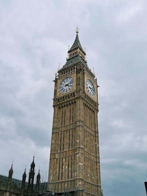 The iconic clock tower‚ officially Elizabeth Tower‚ houses the Great Bell and four quarter bells responsible for the Westminster chimes․ These chimes aren’t simply a tune; they’re a complex sequence played throughout the day․ Every 15 minutes‚ a portion of the Westminster melody is sounded‚ culminating in the hourly strike․